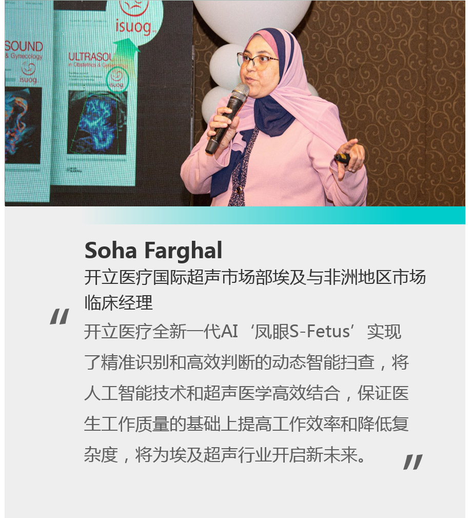来自法尤姆大学医学院的Mohamed Kamal Etman教授作为开立超声的老朋友,见证了人工智能技术为开立医疗创新发展带来的新契机。他直言,“凤眼S-Fetus”简化了超声流程,使超声医师能够更高效精确地做出诊断,并在会议上对基于开立超声基于AI技术“凤眼S-Fetus”的智能超声解决方案进行了案例分享,体现了智能超声技术协助医护为患者提供更好的治疗与关怀。