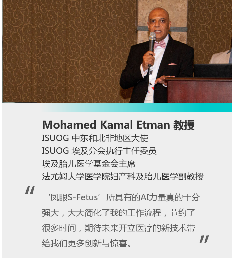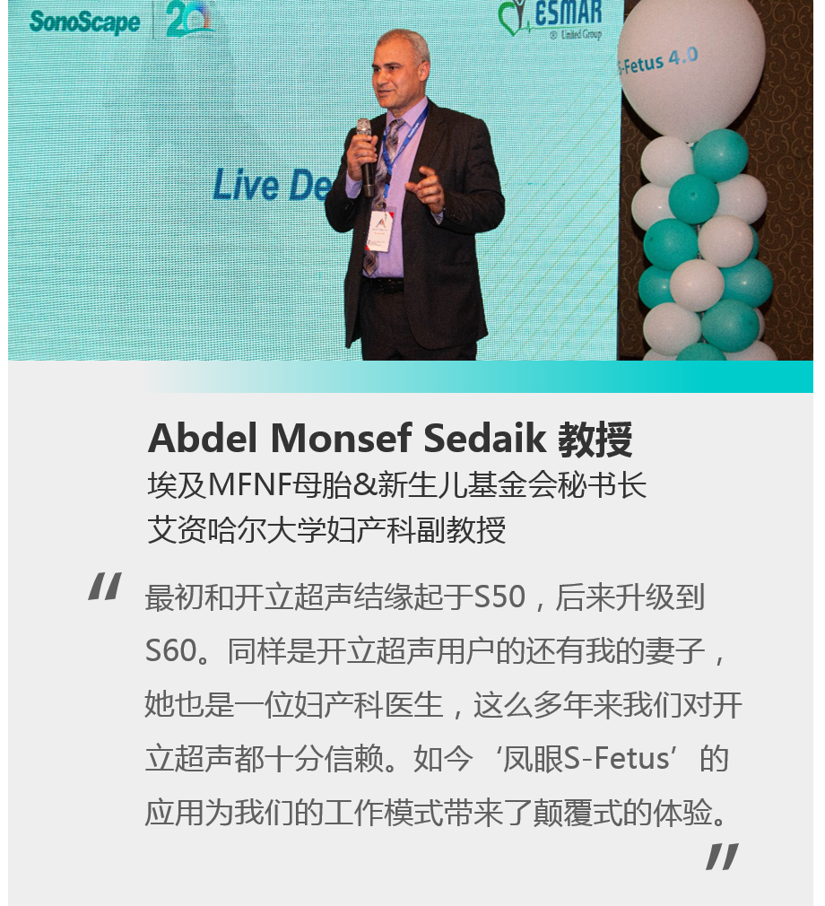 来自艾资哈尔大学的Abdel Monsef Sedaik教授是埃及知名的妇产科专家,作为开立超声的用户会议上分享了“凤眼S-Fetus”的使用体验,表示开立超声的智能功能未来在埃及的产前超声检查领域将会起到重要意义。