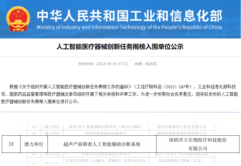 近日,国家工业和信息化部、国家药品监督管理局医疗器械注册司根据《关于组织开展人工智能医疗器械创新任务揭榜工作的通知》(工信厅联科函〔2021〕247号),发布了“人工智能医疗器械创新任务揭榜入围单位”。开立医疗凭借“超声产前筛查人工智能辅助诊断系统”,入选人工智能医疗器械创新任务潜力单位。此次的目的是征集并遴选一批具备较强创新能力的单位集中攻关,推动人工智能医疗器械创新发展,加速新技术、新产品落地应用。