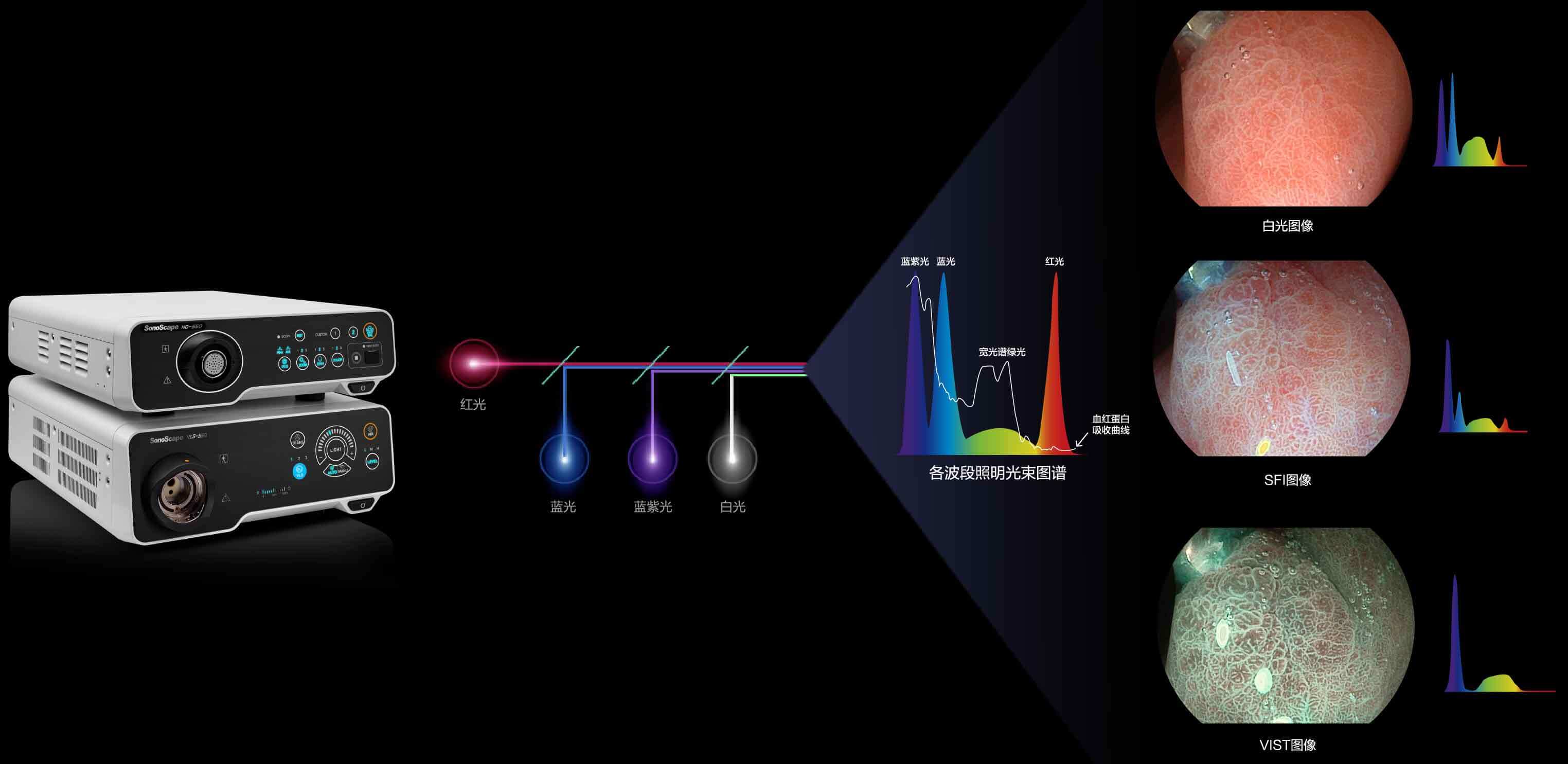 采用光路合束技术,光谱自由度高,实现了更丰富的照明模式,染色模式SFI及VIST,从远景到近景,助力消化道早期疾病诊断。