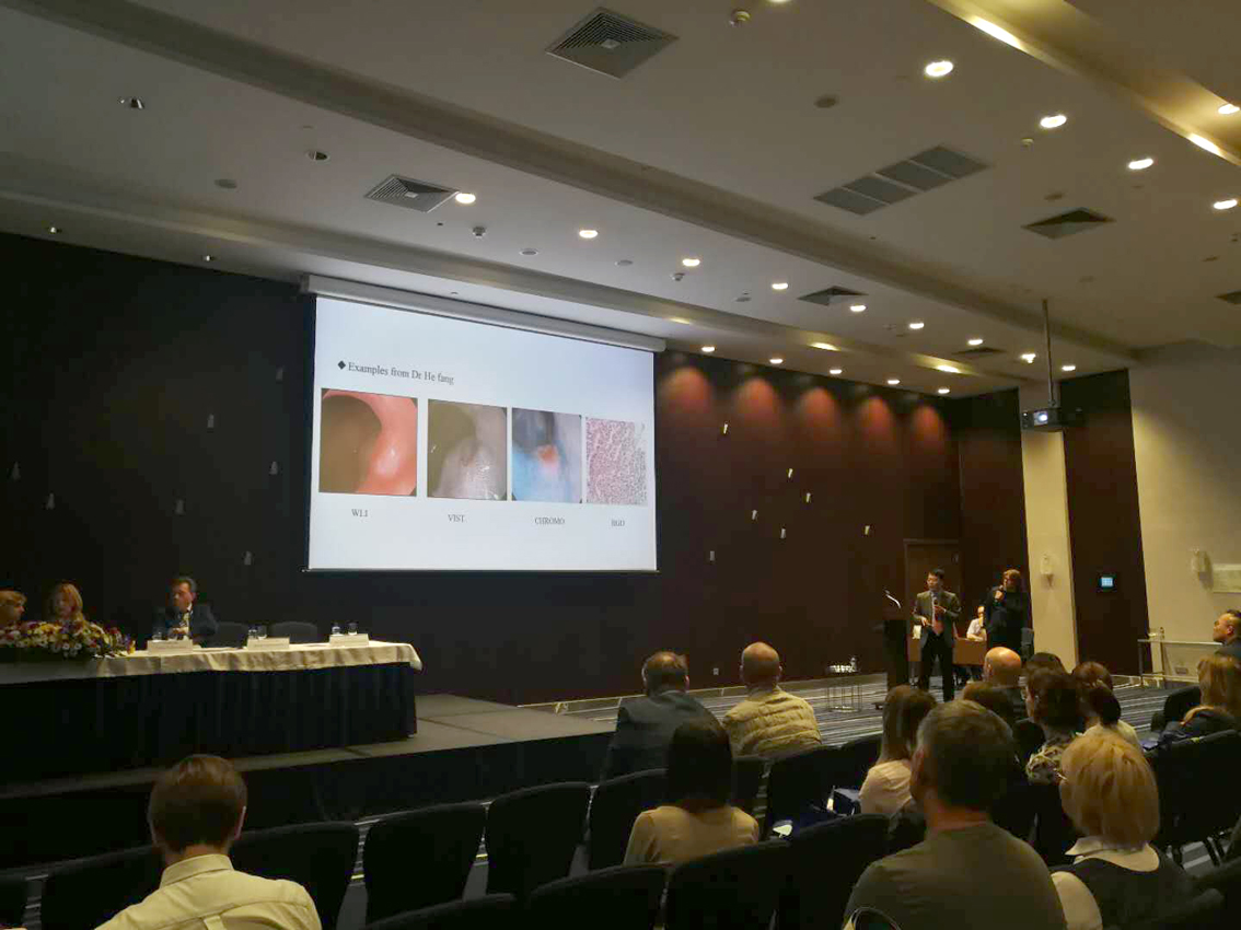 李鹏教授分享了关于染色技术对消化道早期癌发现的应用及重要性,并向全体与会人员介绍并认可中国高清电子内镜HD–500,及其光电复合染色技术VIST的临床应用和价值,现场反响热烈,纷纷提问。李鹏教授专业的解答与分享受到现场与会俄罗斯专家及医护人员的认可并报以热烈的掌声。