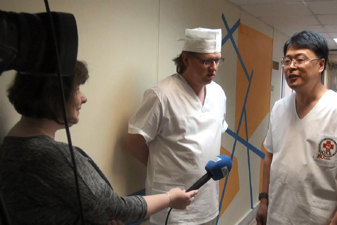 手术病房外,刚完成手术的李鹏主任作为中方专家接受俄罗斯当地电视台的采访。他希望以后能够通过更多的此类跨境医疗学术交流会来共同提升中俄两地的医疗水平。采访结束后,车里雅宾斯克州立医院院方代表带领李鹏主任及开立医疗人员参观该院的消化科室,同时对消化科室的情况进行了交流。离开之前,院方代表再次对李鹏主任及开立医疗人员表达了感谢。