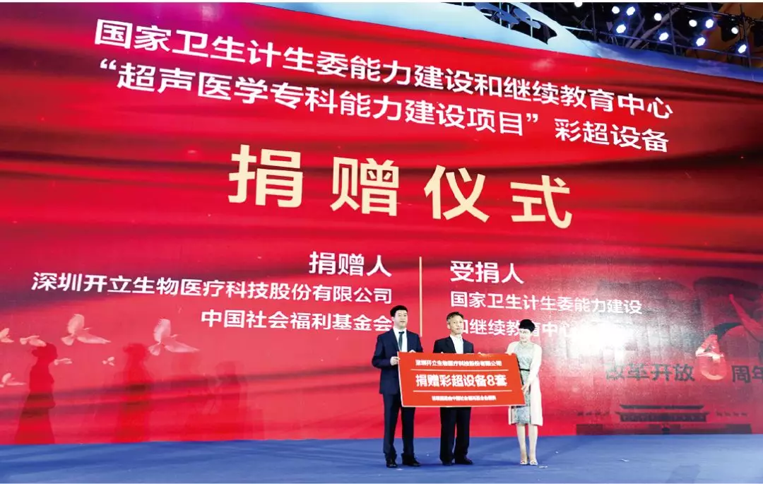 作为民族超声产业的代表企业,开立医疗通过中国社会福利基金会向国家卫计委能力建设和继续教育中心“超声医学专科建设项目”捐赠8套彩色多普勒超声诊断系统,用于支持贫困地区基层超声医学的专科能力建设。国家卫生计生委能力建设和继续教育中心主任杨爱平先生、中国社会福利基金会秘书长蔡君翼女士、开立医疗超声销售总监王宏伟先生共同出席了彩超捐赠仪式。