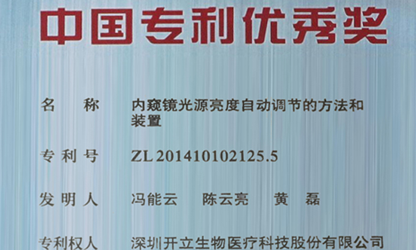 深圳开立生物医疗科技股份有限公司的专利《内窥镜光源亮度自动调节的方法和装置》,经中国医疗器械行业协会推荐,荣获2017年“中国专利优秀奖”。
